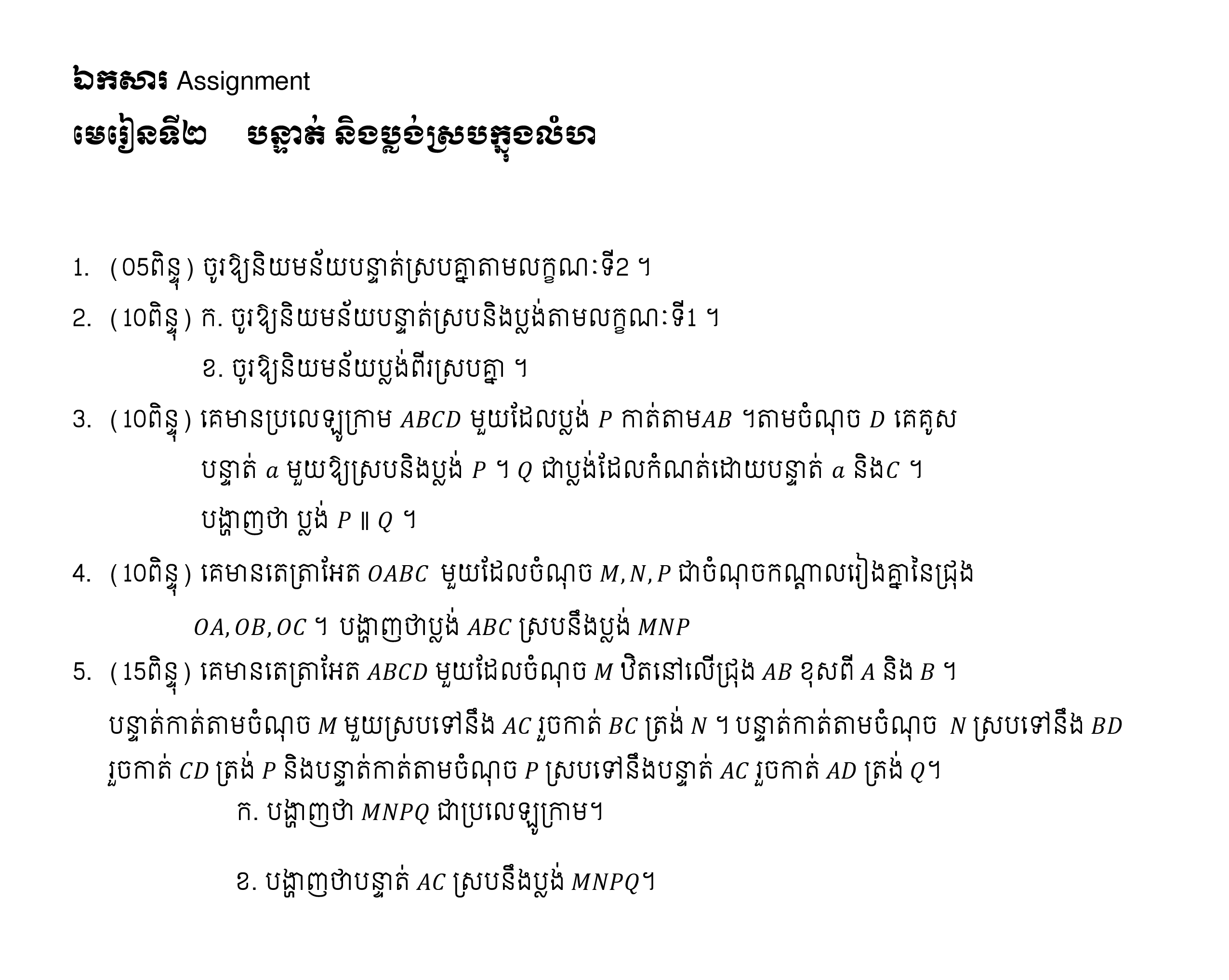 (ជ១១) មេរៀនទី២៖ (កិច្ចការផ្ទះ) បន្ទាត់ និងប្លង់ស្របក្នុងលំហ