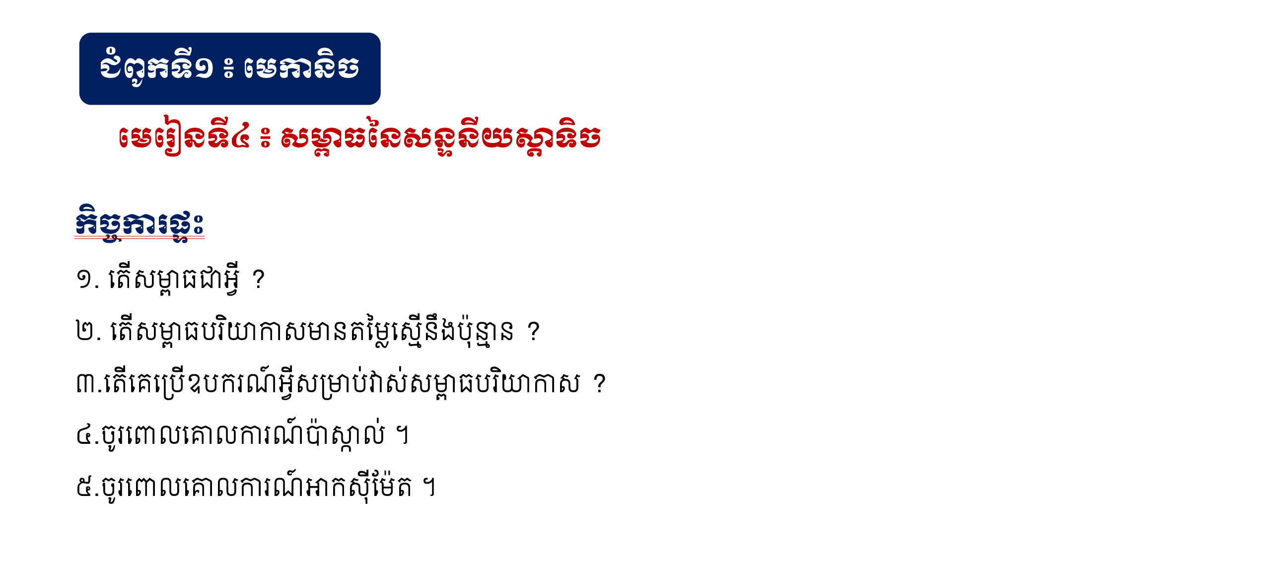 (ជ១)មេរៀនទី៣៖ (កិច្ចការផ្ទះ) កម្មន្ត ថាមពល និងអានុភាព