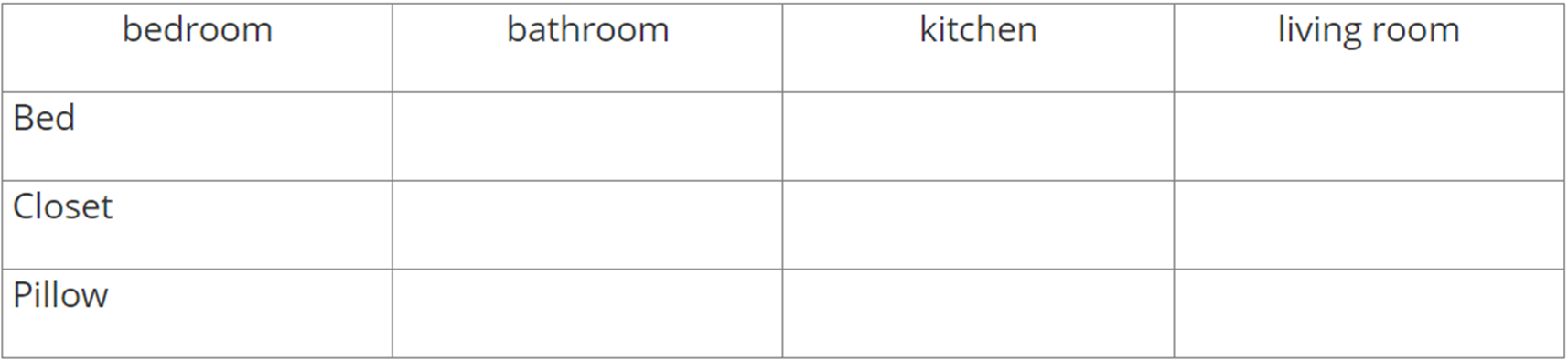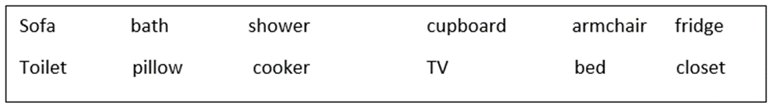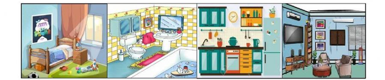 Look at the picture. Choose the words in the box to put in each room.