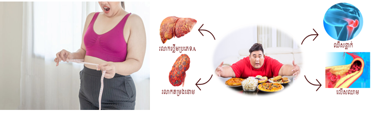ភាពធាត់ហួសអាចបណ្ដាលឱ្យមានជំងឺផ្សេងៗដូចជា ជំងឺបេះដូង ជំងឺទឹកនោមផ្អែម ជំងឺលើសឈាមជាដើម។