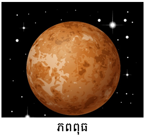 - ជាភពទីមួយស្ថិតនៅជិតព្រះអាទិត្យ និងមានទំហំតូចជាងគេវិលជុំវិញខ្លួនឯងយឺតជាងភពនានាបន្ទាប់ពីភពសុក្រ។ មានរង្វះរណ្ដៅធំៗ តាំងពីរាប់ពាន់លានឆ្នាំមុនកើតឡើងពីការប៉ះទង្គិចយ៉ាងខ្លាំងនៃដុំវត្ថុមកលើផ្ទៃភព។ធ្វើដំណើរជុំវិញព្រះអាទិត្យមួយជុំត្រូវប្រើថេរវេលា 88 ថ្ងៃនៃផែនដី។ សីតុណ្ហភាពពេលថ្ងៃមាន 427\( ^\circ\mathrm{C} \)និងពេលយប់ -170\( ^\circ\mathrm{C} \)។