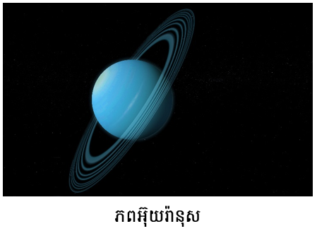 - ជាភពទីប្រាំពីរ បរិយាកាសគ្របដណ្ដប់ដោយអ៊ីដ្រូសែន អេល៉្យូម និងមេតាន។ វិលជុំវិញអ័ក្សខ្លួនឯង ក្នុងមុំទម្រេត 98o និងមានរង្វង់ព័ទ្ធជុំវិញចំនួន 11 មានពណ៌ខ្មៅ កើតពីទឹកកកមេតាន។ មានភពរណបច្រើនជាង 27 មានអង្កត់ផ្ចិតតាមលំដាប់លំដោយពី 32 គ.ម ទៅ 1625 គ.ម។ ធ្វើដំណើរជុំវិញព្រះអាទិត្យមួយជុំ ត្រូវប្រើថេរវេលា 84 ឆ្នាំនៃផែនដីនិងមានសីតុណ្ហភាពទាបបំផុតគឺ -195\( ^\circ\mathrm{C} \)។