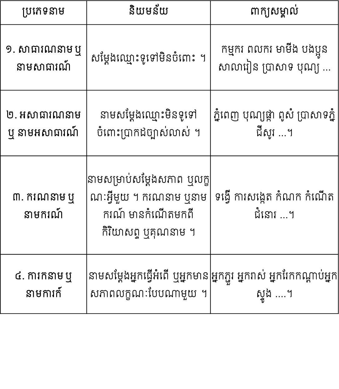 នាម គឺជាពាក្យសម្រាប់សម្គាល់មនុស្ស សត្វ រុក្ខជាតិ ទីកន្លែង វត្ថុ ស្ថានភាព សកម្មភាព ឬគំនិតអ្វីមួយ ។ នាមមានច្រើនប្រភេទ ដូចជា ៖