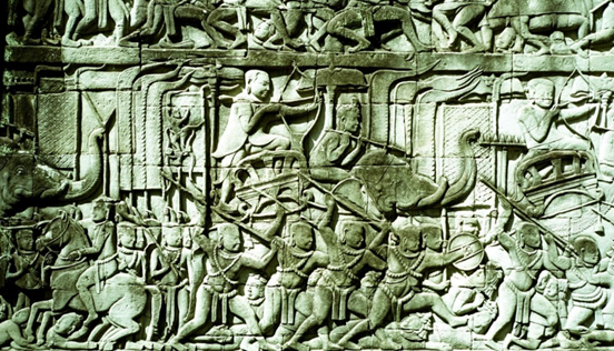 រូបភាពទី១៖ មានរូបចម្លាក់នៅលើជញ្ជាំងប្រសាទមួយដែលមានក្បូរក្បាច់រចនាល្អវិចិត្រមានមនុស្សកាន់លំពែង ដាវ អង់អាចក្លាហាន ការពារពីការឈ្លានពានរបស់សត្រូវ។
