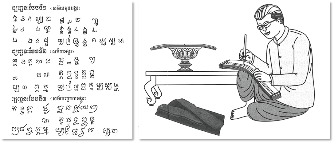 តាមរយៈនេះមានន័យថា គេកំពុងសរសេរ ឬចារអក្សរខ្មែរ ដែលមានន័យថាគេសរសេរពីប្រភពរឿងរ៉ាវផ្សេងៗ លើស្លឹករឹត ឬបង្ហាញពីកំណើតនៃអក្សរខ្មែរ។