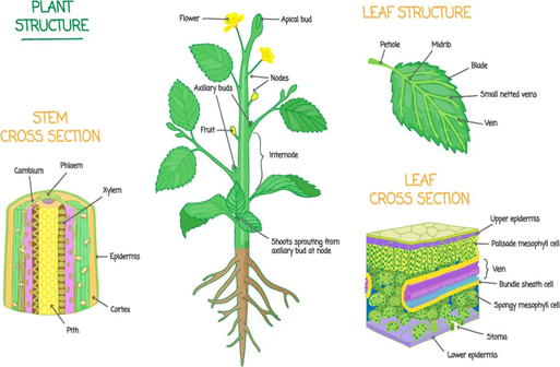 ស្លឹកមានទ្រង់ទ្រាយនិងទំហំខុសៗគ្នាយ៉ាងខ្លាំង។ ដោយមិនគិតពីទ្រង់ទ្រាយខុសៗគ្នារបស់វាស្លឹកមាននាទីយ៉ាងសំខាន់ចំពោះរុក្ខជាតិ។ ស្លឹកចាប់យកថាមពលពន្លឺព្រះអាទិត្យហើយផលិតអាហារក្នុងដំណើររស្មីសំយោគ។ បើយើងកាត់ស្លឹករុក្ខជាតិហើយពិនិត្យតាមគែមដែលកាត់នោះដោយមីក្រូទស្សន៍ អ្នកនឹងឃើញរូបផ្គុំដូចក្នុងរូបទី5,7។  |