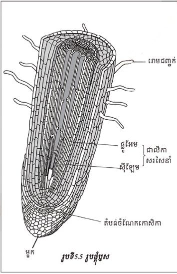 រូបទី5,5 បង្ហាញពីរូបផ្គុំរបស់ឫសមួយ។ គួរកត់សំគាល់ថា នៅផ្នែកខាងចុងឫសត្រូវបានព័ទ្ធជុំវិញនិងការពារដោយទម្រង់មួយដែលហៅថាមួក។ មួកការពារឫសក្នុងការប៉ះទង្គិចនឹងថ្មនៅពេលឫសលូតលាស់ពីដី។ ផ្នែកខាងក្រោយបន្ទាប់ពីមួកមានកោសិកាជាច្រើនធ្វើចំណែកដើម្បីបង្កើតកោសិកាឫសថ្មីៗទៀត។រោមជញ្ជក់លូតលាស់ចេញពីផ្ទៃរបស់ឫស។ រោមឆ្មារៗទាំងនេះអាចជ្រៀតចូលទៅក្នុងដីដើម្បីស្រូបទឹកនិងសារធាតុខនិជ។  |