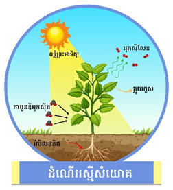 រស្មីសំយោគ គឺជាដំណើរការដែលកោសិកាចាប់យកថាមពលពន្លឺព្រះអាទិត្យ ហើយប្រើប្រាស់ថាមពលនេះដើម្បីផលិតអាហារ (គ្លុយកូស) ។សារពាង្គកាយអាចផលិតអាហាររបស់វាដោយផ្ទាល់ហៅថា ស្វ័យជីព ។ សារពាង្គកាយដែលមិនអាចផលិតអាហាររបស់វាដោយផ្ទាល់បានហៅថា បរជីព ។ |