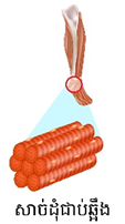 សាច់ដុំជាប់ឆ្អឹងភ្ជាប់ទៅនឹងឆ្អឹងដោយសារសរសៃពួរ ។ សរសៃពួរជាជាលិកាដ៏រឹងមាំសម្រាប់ភ្ជាប់សាច់ដុំទៅនឹងឆ្អឹង។ កោសិកាសាច់ដុំជាប់ឆ្អឹងមានឆ្នូតហៅថា សាច់ដុំឆ្នូត ។ វាជាសាច់ដុំឆន្ទៈដែលមានលក្ខណៈឆាប់នឿយហត់ត្រូវការសម្រាក ម៉្យាងទៀតឆាប់មានប្រតិកម្មរហ័សណាស់។