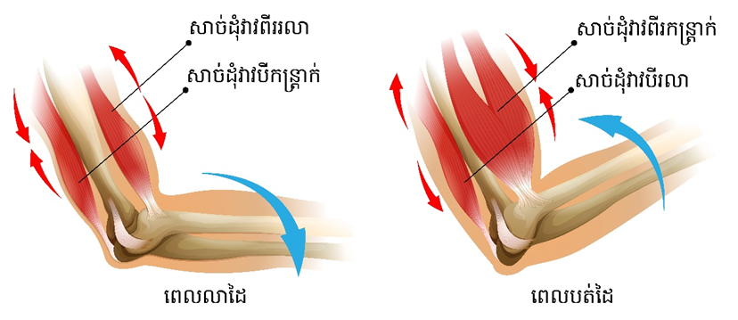 ចលនាប្រព្រឹត្តទៅបានគឺដោយសាតែមានការកន្ត្រាក់ និងទាញរបស់សាច់ដុំ ។ ក្នុងសារពាង្គកាយមនុស្សមានសាច់ដុំចំនួនប្រហែល ៦០០ ហើយពួកវាមាននាទីផ្សេងៗគ្នាទៅតាមប្រភេទរបស់វា ។