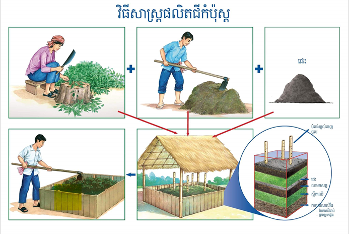 · ទុកបីបួនថ្ងៃមើលជីឡើងកម្ដៅល្អ ត្រូវជ្រោយឲ្យសព្វទើបជីរលួយបានល្អ
