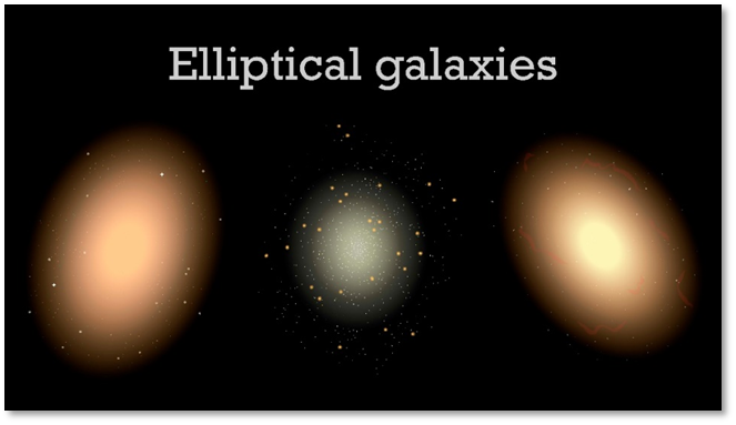 ◾ កាឡាក់ស៊ីរាងពងក្រពើ ផ្ទុកដោយធូលីតូចៗ និងឧស្ម័ន (តារាក្នុងកាឡាក់ស៊ីជាតារាចាស់ជាងគេ) ។