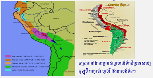 - ចក្រភពអាំងកា ស្ថិតនៅទ្វីបអាមេរិចខាងត្បូង មានរាជធានីគូស្កូ (ប៉េរូ) ចក្រភពអាំងការគ្របដណ្តប់លើទឹកដីប្រទេសប៉េរូ កូឡុំប៊ី អេក្វាឌ័រ បូលីវី និងអាសង់ទីន។