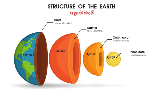 ផែនដីមានលក្ខណៈពិសេសសម្រាប់ជីវិតរស់នៅដូចជា ដី ទឹក និងខ្យល់។ គេបានសិក្សាបន្ថែមពីទម្រង់ក្នុងនៃ ផែនដី ហើយបានចែកចេញជាបីផ្នកគឺ សំបកផែនដី ម៉ង់តូផែនដី និងស្នូលផែនដី។