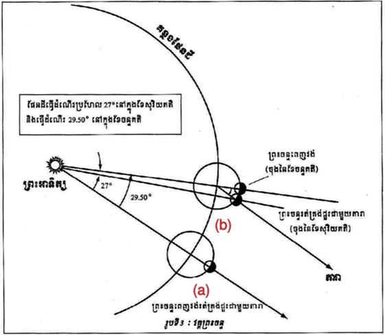 តាមពិតព្រះចន្ទធ្វើដំណើរ ២៧ថ្ងៃ ៨ម៉ោង នៃ ផែនដីស្មើនឹង១ឆ្នាំនៅលើភពព្រះចន្ទ។ មូលហេតុនៃការ គិតបែបនេះគឺដោយសារនៅពេលព្រះចន្ទធ្វើដំណើរបាន មួយជុំផែនដីដល់ទីតាំងដើមផែនដីក៏ត្រូវធ្វើដំណើរទៅមុខព្រះអាទិត្យដែរ។ នៅពេលនោះព្រះចន្ទមិន ទាន់រត់ត្រង់ ជួរជាមួយផែនដីនិងព្រះអាទិត្យ។ ដើម្បីឱ្យអង្គទាំងបីរត់ ត្រង់ជួរគ្នា ព្រះចន្ទត្រូវធ្វើដំណើរ ពីរថ្ងៃបួនម៉ោងទៀត ដើម្បីឱ្យចន្ទឆ្លងកាត់គ្រប់វគ្គទាំងអស់គេបាន27ថ្ងៃ8ម៉ោង+2ថ្ងៃ4ម៉ោង =29ថ្ងៃ12ម៉ោង ឬប្រហែល30ថ្ងៃ។