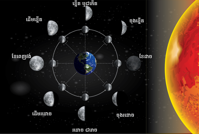 ព្រះចន្ទឆ្លងកាត់វគ្គទាំងអស់រាល់ ២៩ថ្ងៃ ១២ម៉ោងម្តង។ កាលណាព្រះចន្ទឆ្លងកាត់ចន្លោះ ផែនដីនិងព្រះអាទិត្យផ្នែកដែលឈមនឹងផែនដី ងងឹតសូន្យមិនអាចមើលឃើញនៅលើមេឃ ហៅថាខែដាច់។ពន្លឺមួយភាគតូចដែលអាចមើលឃើញលើព្រះចន្ទគឺខែដើមខ្នើត។ខែខ្នើតគឺជា ពេលដែលពន្លឺព្រះចន្ទរះឡើងបន្ទាប់ពីខែដាច់ ព្រះចន្ទធ្វើដំណើរបានមួយភាគបួននៃគន្លងរបស់វាមានពន្លឺពាក់កណ្តាលហៅថាខែ៨កើត។ ផ្ទៃពន្លឺកាន់តែរីកធំមុនព្រះចន្ទពេញវង់ហៅថាខែចុងខ្នើត។ ផ្ទៃព្រះចន្ទទាំងមូលមានពន្លឺពេញហៅថាខែពេញវង់។ ក្រោយ ខែពេញវង់ផ្ទៃពន្លឺកាន់តែរួមតូចហៅថាដើមខែរនោច។ ព្រះចន្ទធ្វើដំណើរអស់រយៈពេលពីរសប្តាហ៍ម្តងដោយឆ្លងកាត់ ខែដើមខ្នើតខែ៨កើត ខែពេញវង់ ខែរនោច ខែ៨រោច ខែចុងរនោច ហើយត្រឡប់ទៅខែដាច់ បន្ទាប់មកវគ្គនៃព្រះចន្ទ ចាប់ផ្តើមសារជាថ្មីទៀត។