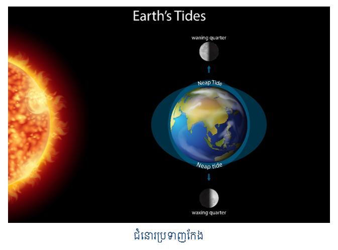 ផែនដីមានទំនាញទៅព្រះអាទិត្យហើយព្រះចន្ទក៏មាន ទំនាញមកលើផែនដីដូចជាការ ទាញទឹកសមុទ្រ និងរូបធាតុ ផ្សេងៗ ទៀតទៅរកវា។ ទំនាញនេះមាន កម្លាំងខ្លាំងនៅផ្នែកផែនដីដែលស្ថិតនៅជិតព្រះចន្ទ ហើយមានកម្លាំង ខ្សោយនៅផ្នែក ដែលស្ថិតនៅឆ្ងាយ ពីព្រះចន្ទ។មូលហេតុនេះគឺដោយសារកម្លាំងទំនាញ ខ្សោយនៅពេល ចម្ងាយកាន់តែឆ្ងាយ(តាមច្បាប់ទំនាញរបស់ញ៉ូតុន)។ ភាពខុសគ្នារវាងទំនាញបានទាញទឹកសមុទ្រឱ្យប៉ោងនៅ ផ្នែកឈម នឹងមុខផែនដី ប៉ុន្តែវាក៏បណ្តាលឱ្យមានភាពប៉ោងដូចគ្នានៅផ្នែកម្ខាងទៀតនៃផែនដី។
