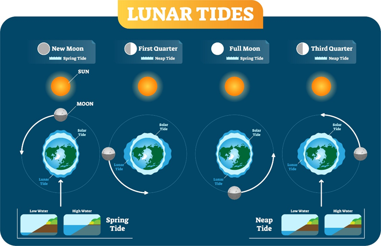 ដូចនេះជំនោរសមុទ្រកើតឡើងដោយសារឥទ្ធិពលនៃរង្វិលខ្ញាល់របស់ផែនដីទំនាញព្រះចន្ទ និងព្រះអាទិត្យ។ជំនោរសមុទ្រ កើតឡើងរាល់ ១២ម៉ោងកន្លះម្តង និងជះឥទ្ធិពលដោយរាងរបស់ឆ្នេរ។