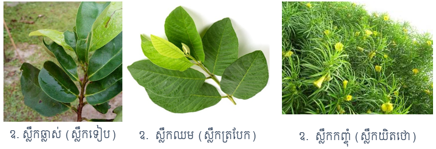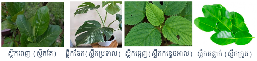 + ស្លឹកពេញ : ស្លឹករាបស្មើ ហើយរលីង។ ឧទាហរណ៍ ស្លឹកស្វាយ ស្លឹកខ្នុរ…។