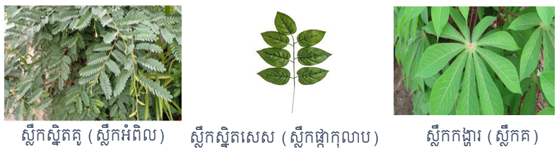 + ស្លឹកកង្ហារ : ជាស្លឹកដែលកូនស្លឹកភ្ជាប់នឹងចុងទងស្លឹក នៅកន្លែងតែមួយ។ ឧទាហរណ៍ ស្លឹកគ។