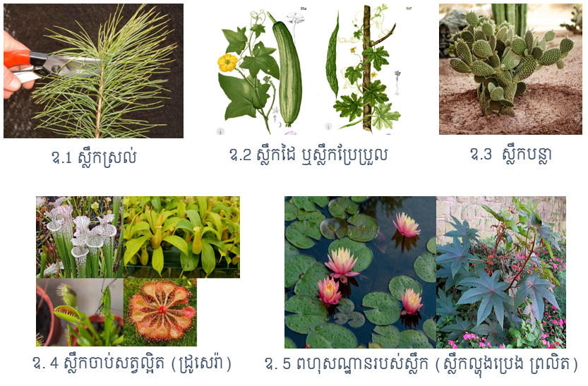 - ដើមតោង: វារតោងលើជន្លង់ តោងទៅនឹងជញ្ជាំង ឬដើមឈើផ្សេងទៀតដោយឫសព្រយោងរបស់វា។ ដើមខ្លះថ្ពក់ទៅនឹងរុក្ខជាតិជិតខាងដោយបន្លា (ដើមម្រះ ដើមល្ពៅ ននោង..)
