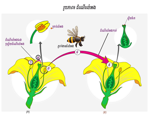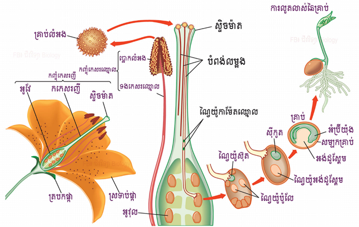 - បន្ទាប់ពីគ្រាប់លំអងធា្លក់ទៅលើស្ទិចម៉ាតដោយសារខ្យល់ ឬសត្វល្អិត អូវែក៏ក្លាយទៅជាផ្លែ។ អូវុលក៏ក្លាយទៅជាគ្រាប់។ បន្ទាប់ពីដំណុះនៃគ្រាប់ អំប្រ៊ីយ៉ុងដែលនៅខាងក្នុងគ្រាប់ក៏ដុះលូតលាស់ទៅជា កូនរុក្ខជាតិ។