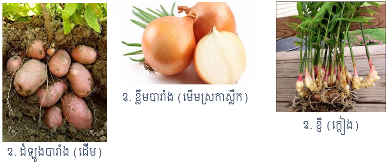 - មើម : ដើមនៅក្នុងដី ដែលមានផ្ទុកសារធាតុបម្រុង (ដំឡូងបារាំង)។