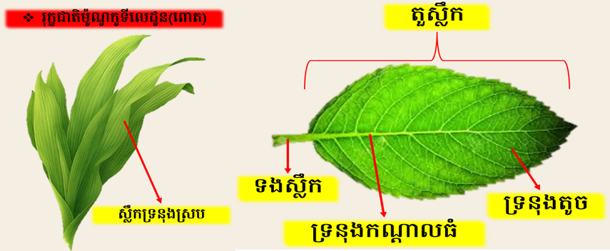 - គេចែកស្លឹកជា២ប្រភេទគឺ ស្លឹកទោល និងស្លឹករួម។