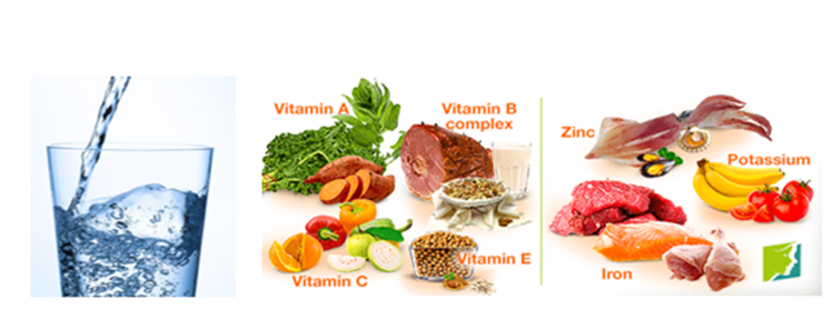 - ដើម្បីមានសុខភាពល្អ និងមានការលូតលាស់សារពាង្គកាយគ្រប់រូបត្រូវការប្រភេទអាហារសំខាន់ៗដូចជា៖
