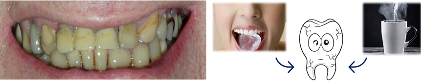 - ក្រៅពីនេះ បម្រែបម្រួលសីតុណ្ហភាពនៃការញ៉ាំទឹកកក ឬទឹកក្ដៅពេក និងការខាំវត្ថុរឹងខ្លាំងបណ្ដាលឱ្យប្រេះកាចាធ្មេញនាំឱ្យខូចធ្មេញ។