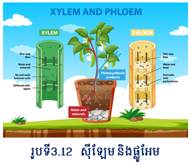+ ស៊ីឡែម: ដឹកនាំទឹក និងអំបិលខនិជ រលាយផ្សេង(រុក្ខរសដើម)ពីឫសតាមដើម ទៅកាន់ស្លឹករុក្ខជាតិ។