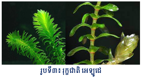 - អេឡូដេជារុក្ខជាតិដែលច្រើនដុះនៅក្នុងបឹង។ វាមានស្លឹកតូចៗស្ដើង ផ្គុំគ្នាបីៗតាមថ្នាំនីមួយៗ។