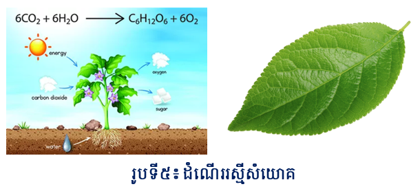 - ដំណើរការដែលរុក្ខជាតិបៃតងចាប់យកថាមពលពីពន្លឺព្រះអាទិត្យ ហើយប្រើប្រាស់សម្រាប់ផលិតអាមីដុងក្នុងកោសិកាហៅថា រស្មីសំយោគ។