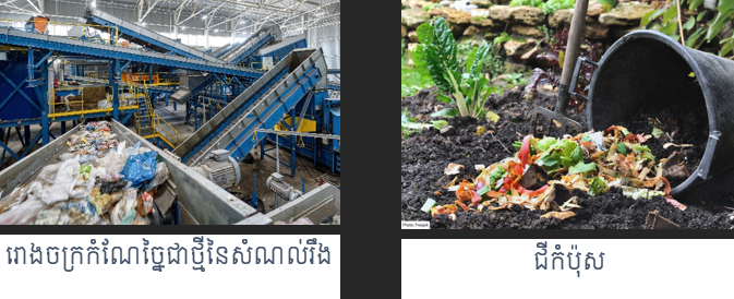 \( \bullet \) ធ្វើជាជីកំប៉ុសពីសំណល់រឹងសរីរាង្គដូចជា សំណល់បន្លែ ផ្លែឈើ សំបកដូង...។