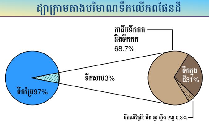 បរិមាណទឹកសាបដែលមនុស្ស សត្វ និងរុក្ខជាតិអាចប្រើប្រាស់មានចំនួនតិចតួចបំផុត។ ទឹកសាបលើផែនដីមានតែ 3%​ ប៉ុណ្ណោះ ហើយក្នុងចំនួននេះមិនអាចបរិភោគបានទាំងអស់ទេ ព្រោះបរិមាណនេះបូកបញ្ចូលទាំងទឹកកកតំបន់ប៉ូលខាងជើងនិងខាងត្បូងផង។ មានតែទឹកសាប 15% ទេ ដែលអាចប្រើប្រាស់សម្រាប់ប្រជាជនទូទាំងពិភពលោក។ ទឹកសាបមនុស្សប្រើប្រាស់មានប្រភពសំខាន់ពីរគឺ ទឹកលើផ្ទៃដី​ និងទឹកក្នុងដី។ យើងទាំងអស់គ្នាត្រូវយកចិត្តទុកដាក់ប្រើប្រាស់ទឹកដោយសន្សំសំចៃ បើពុំនោះទេយើងនឹងជួបកង្វះទឹកសាបនៅថ្ងៃអនាគតមិនខាន។