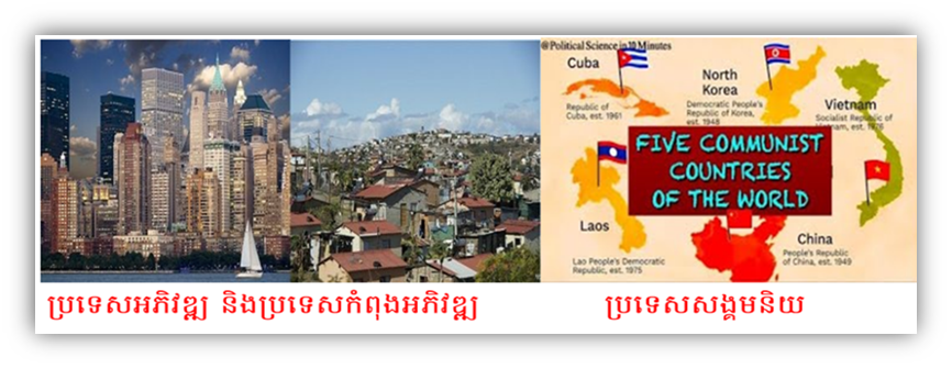 ចំពោះប្រទេសកំពុងអភិវឌ្ឍ សម្គាល់ទៅលើប្រទេសទាំងឡាយណាដែលមានខឿនសេដ្ឋកិច្ចទន់ខ្សោយនៅឡើយ និយាយរួមគឺគេចង់សំដៅទៅលើប្រទេសក្រីក្រទើបងើបពីសង្គ្រាមឬទើបរួចផុតពីនឹមអាណានិគមជាដើម។ ប្រទេសអភិវឌ្ឍ សម្គាល់ទៅលើប្រទេសទាំងឡាយណាដែលមានខឿនសេដ្ឋកិច្ចរឹងមាំ ទាំងផ្នែកយោធា កសិកម្ម ឧស្សាហកម្ម។ ប្រទេសសង្គមនិយម សម្គាល់ទៅលើប្រទេសទាំងឡាយណាដែលស្ថិតនៅក្នុងប្លុក (កុម្មុយនីស្ត) ដែលកម្រិតនៃការអភិវឌ្ឍមានកម្រិតទាប។