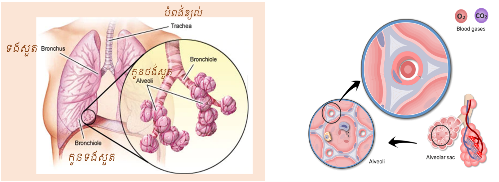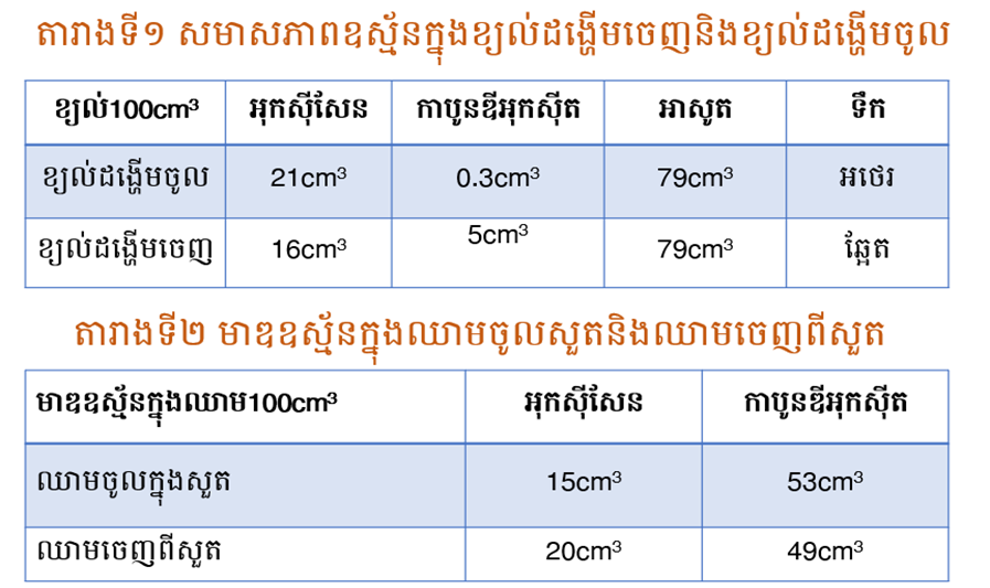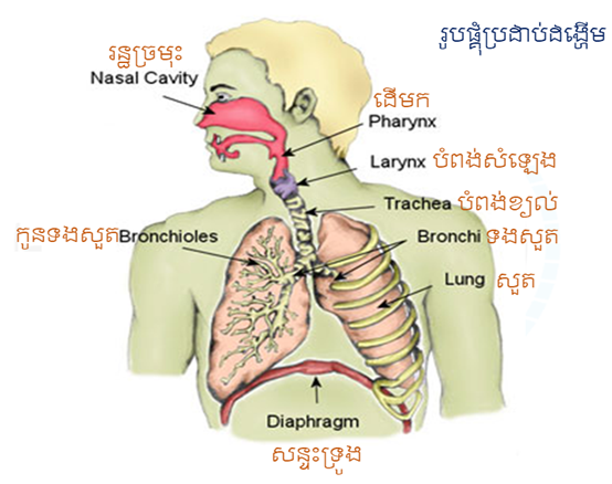 ចង្វាក់ដង្ហើម : ចលនាដង្ហើមដែលមានក្នុងមួយនាទី។ សម្រាប់មនុស្សពេញវ័យដែលសម្រាកមិនធ្វើការមានចលនាដង្ហើមចំនួន ១៦ដងក្នុងមួយនាទី។ ចង្វាក់ដង្ហើមប្រែប្រួលទៅតាមភេទ អាយុ និងសកម្មភាពការងារ។ សួតមានពីរដែលមានទម្ងន់សរុបប្រហែល 1300g សួតស្តាំ (700g) និងសួតឆ្វេង (600g) ចំណុះខ្យល់សរុបក្នុងសួតមានប្រហែល 5 លីត្រ។