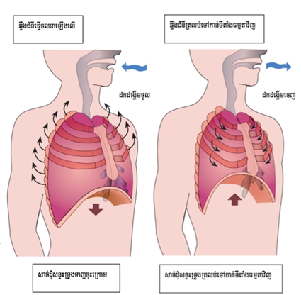 នៅពេលដកដង្ហើមចូលសាច់ដុំដង្ហើមកន្រ្តាក់ ហើយទាញឆ្អឹងជំនីរឱ្យប៉ោងឡើង ឯសាច់ដុំសន្ទះទ្រូងស្រុតចុះធ្វើឱ្យប្រអប់ទ្រូងឡើងប៉ោង។ នៅពេលដង្ហើមចេញ សាច់ដុំដែលទាញឆ្អឹងជំនីររលាវិញ ធ្វើឱ្យឆ្អឹងជំនីរស្រុតចុះ និងសាច់ដុំសន្ទះទ្រូងងើបឡើងវិញ ហើយប្រអប់ទ្រូងរួមមកវិញ។