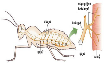 O2 ក្នុងខ្យល់ចូលតាមរន្ធខ្យល់ដែលនៅផ្នែកពោះតាមចំហៀងខ្លួនទាំងសងរបស់សត្វល្អិត។ ខ្យល់ចូល និងចេញពីប្រព័ន្ធបំពង់ខ្យល់ដោយសារការកន្រ្តាក់នៃសាច់ដុំទាំងអស់នៃសារពាង្គកាយ។