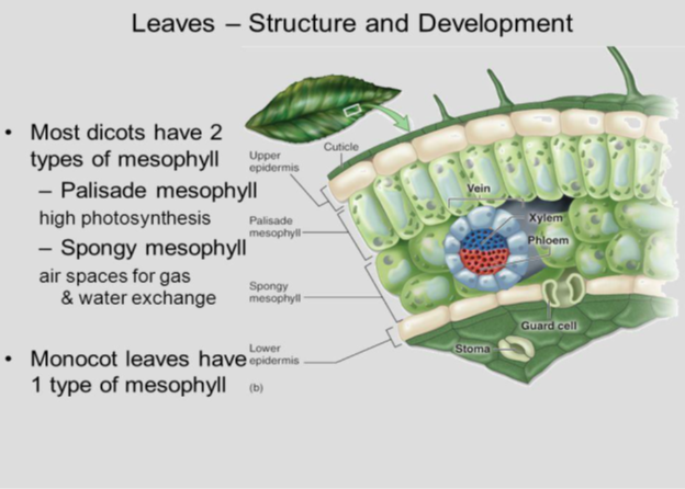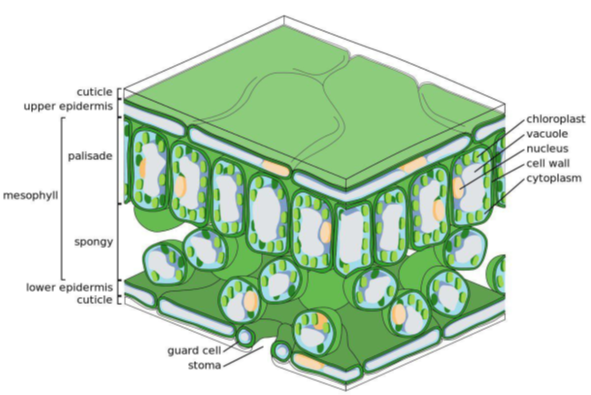 • មេសូភីលស្ពោត៖ ស្ថិតនៅខាងក្រោមស្រទាប់ប៉ាលីសាត ដែលកើតពីកោសិកាជាច្រើនមានទ្រង់ទ្រាយ មិនទៀងទាត់។ នៅលើស្រទាប់ស្អាតមានប្រហោងធំៗ នៅចន្លោះកោសិកានីមួយៗ ហើយមានក្លរ៉ូប្លាសតិចជាងមេសូភីលប៉ាលីសាត។