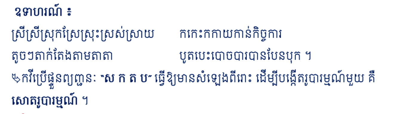 ឬស្រៈដដែលៗក្នុងឃ្លា ឬវគ្គ ដើម្បីបង្កើតឱ្យសំឡេងពីរោះ និងបង្កើតរូបារម្មណ៍មួយ គឺ