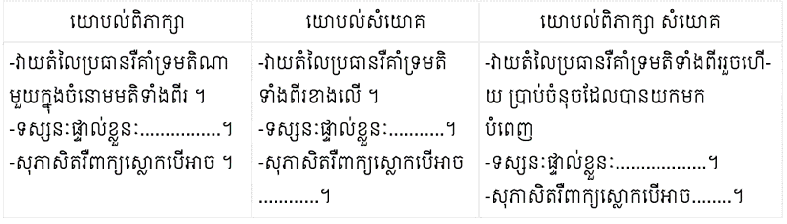-    មតិស្រប ៖ ត្រូវនិយាយអោយស្របទៅនឹងប្រធាន ហើយរកអំណះអំណាង ឬឧទាហរណ៍