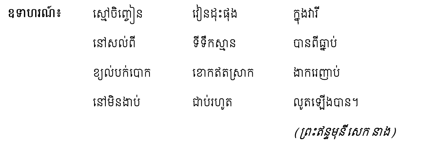 និងពាក្យបីព្យាង្គនៅឃ្លាដើមបន្ទាប់គឺ៖