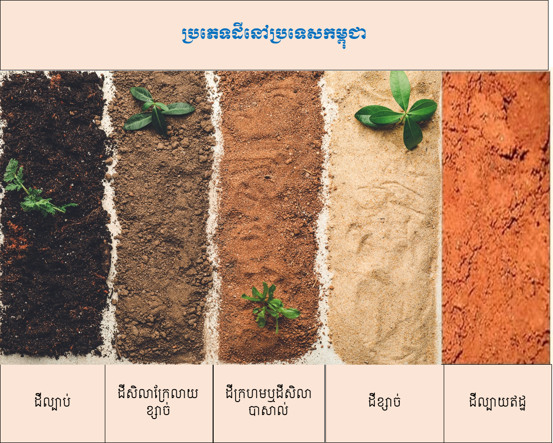 + គេអាចចែកដីនៅប្រទេសកម្ពុជា ជា ៥ប្រភេទ ដូចជា៖