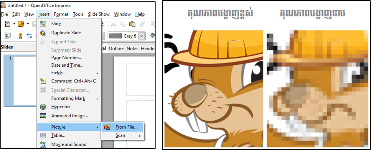 ដើម្បីបញ្ចូលរូបភាព យើងត្រូវចុច ម៉ឺនុយ Insertà Pictureà From File àធ្វើការជ្រើសរើសរូបភាពតាមទីតាំងដែលបានដាក់ àចុចយល់ព្រម។