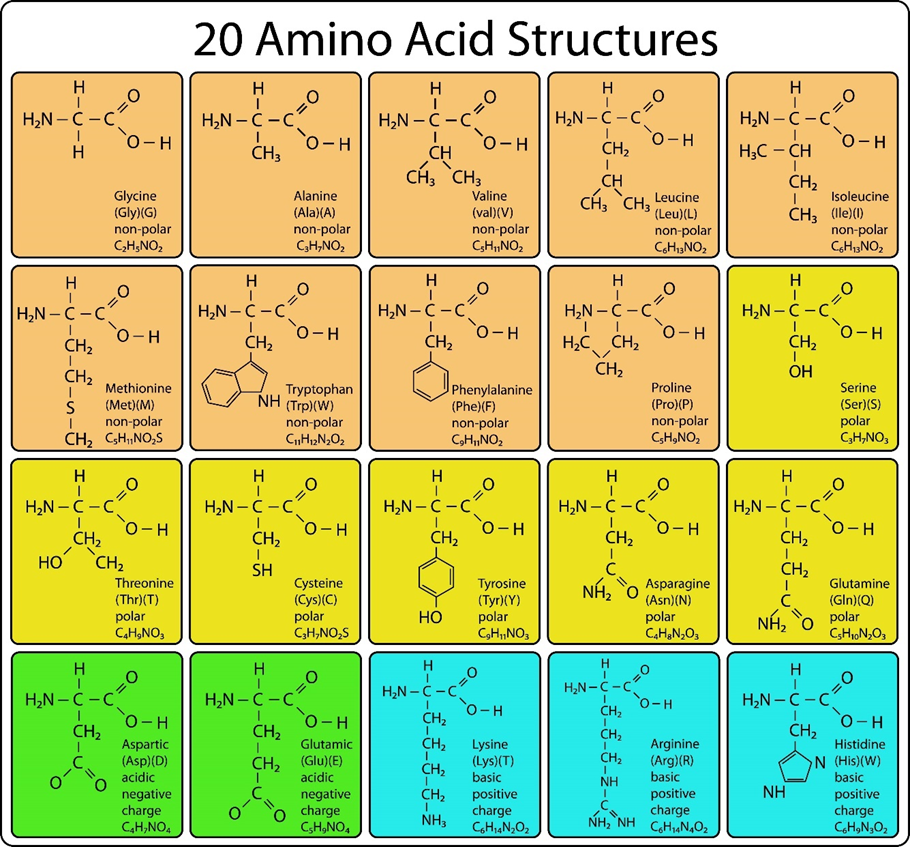 អាឡានីន អាស៊ីនីន អាស្ប៉ារ៉ាស៊ីន អាស៊ីតអាស្ប៉ាទិច ស៊ីស្តេអ៊ីន អាស៊ីតគ្លុយតាមិច គ្លុយតាមីន គ្លីស៊ីន អ៊ីស្ដេឌីន អ៊ីសូឡឺស៊ីន ឡឺស៊ីន លីស៊ីន មេត្យូនីន ផេនីលអាឡានីន ប្រូលីន សេរីន ត្រេអូនីន ទ្រីបតូផាន ទីរ៉ូស៊ីន វ៉ាលីន |