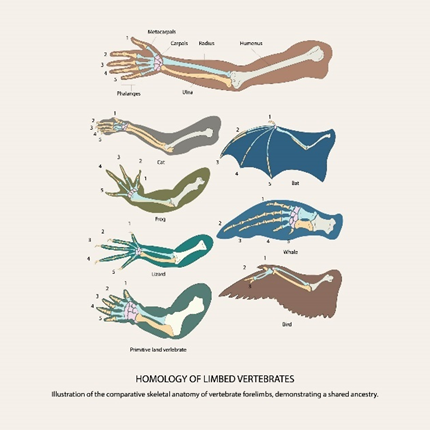 ភស្តុតាងដែលបង្ហាញថាសត្វឆ្អឹងកងទាំងអស់មានបុព្វរួមតែមួយមានដូចជា៖ រូបផ្តុំក្នុងដូចគ្នា (គ្រោង ឆ្អឹងក្នុង និងមានឆ្អឹងកង) ។ ស្លាបបក្សី ព្រុយដូហ្វាំង ដៃមនុស្សមានរូបរាងនិងនាទីខុសគ្នាតែមានរូបផ្តុំដូចគ្នា។ ដូចនេះវាមានប្រភេទតែមួយនៅក្នុងដំណាក់អំប្រ៊ីយ៉ុង។សរីរាង្គអូម៉ូឡូក ជាសរីរាង្គដែលមាននាទីខុសគ្នា តែមានរូបផ្តុំនៅក្នុងប្លង់តែមួយ។ ដូចជាអវៈយវៈខាងមុខនៃគោ ព្រួយដូហ្វាំង ឬត្រីបាឡែន បក្សី ប្រចៀវ និងមនុស្ស ។